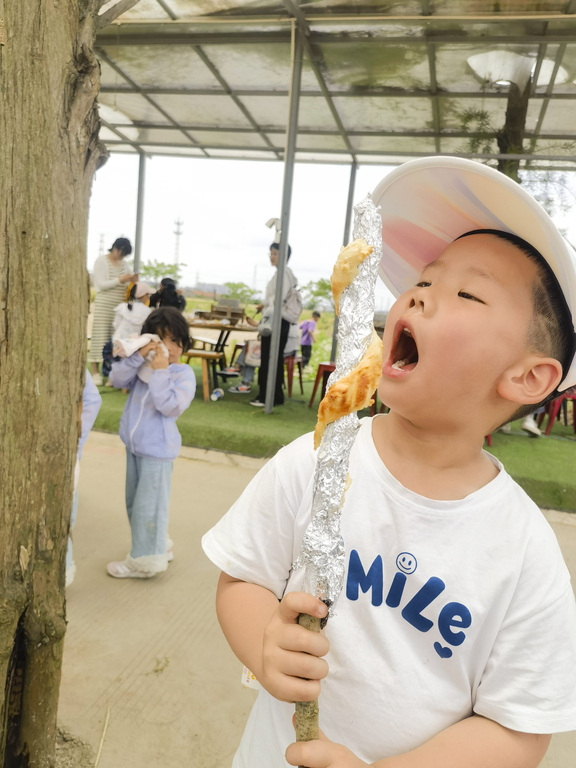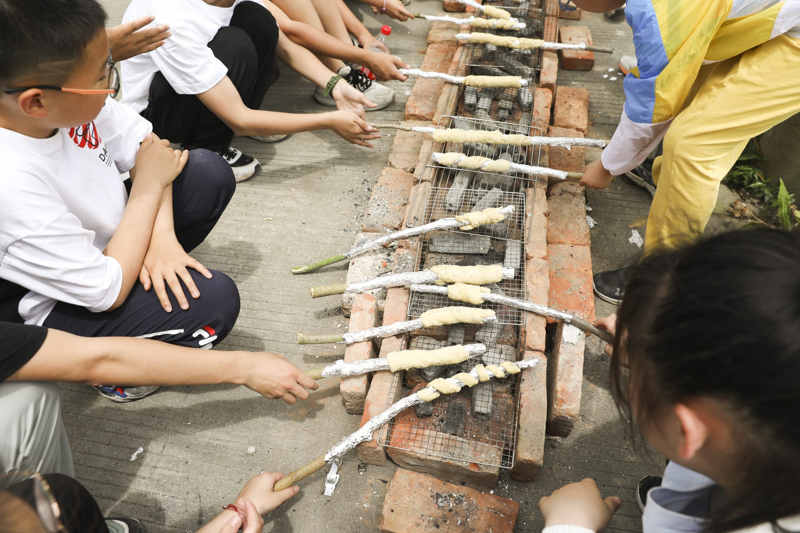 ? ? ? ?在DIY樹棍面包環(huán)節(jié)中,孩子們在老師們的指導下,和面粉,穿面包,搭建灶臺,生火烤面包啦!木柴燃燒,火焰升騰也帶著溫度。看小麥粉在手中變得胖胖軟軟,散發(fā)出香甜的味道,不多久一根根考得發(fā)脆的樹棍面包就出爐啦!