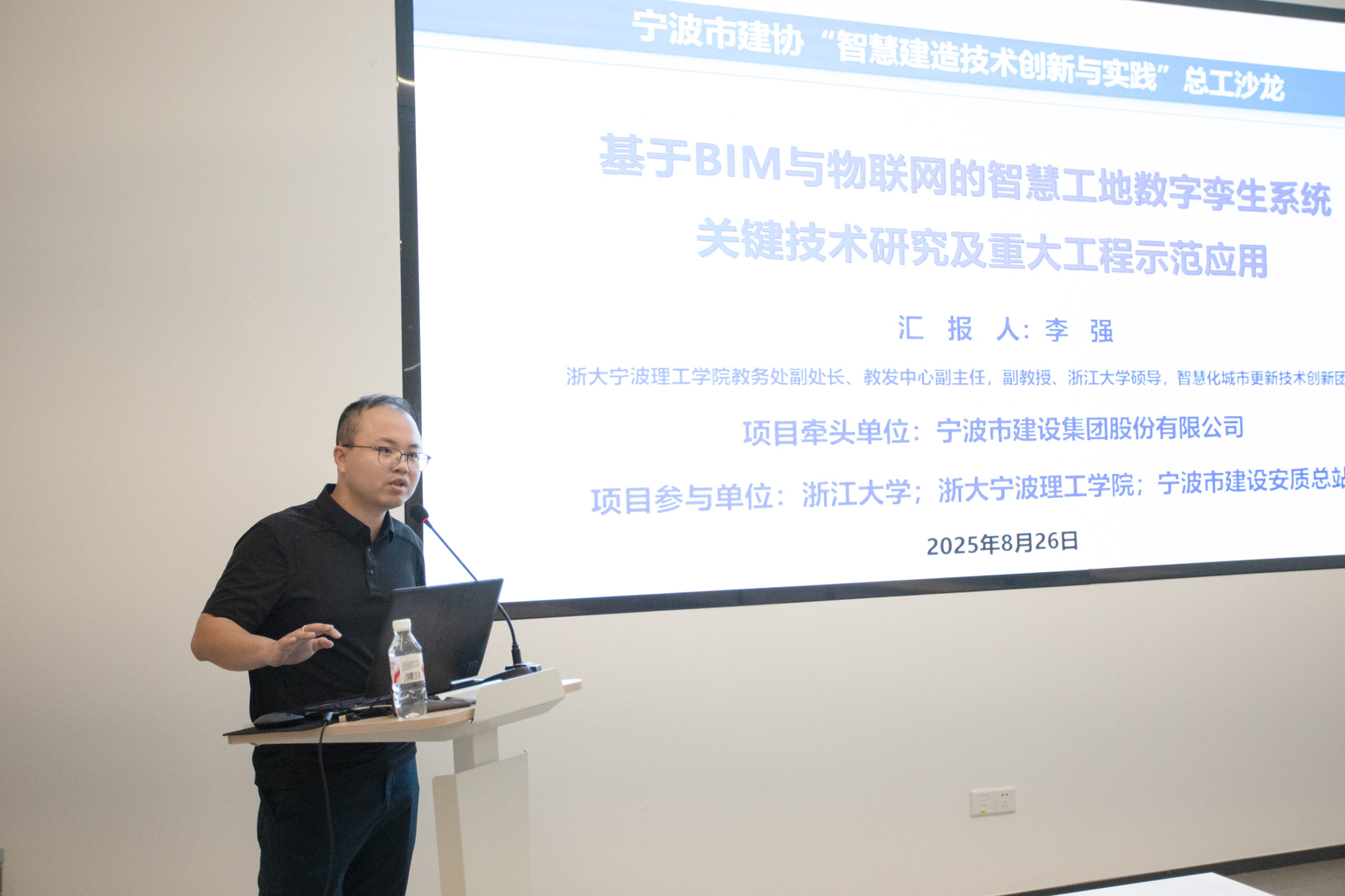 ? ? ? ?會(huì)上,浙大寧波理工學(xué)院教務(wù)處副處長(zhǎng)李強(qiáng)副教授作為主講嘉賓,系統(tǒng)介紹“智慧化城市更新技術(shù)創(chuàng)新研究團(tuán)隊(duì)”關(guān)于智慧工地?cái)?shù)字孿生系統(tǒng)的前沿研究與落地實(shí)踐。他重點(diǎn)闡述團(tuán)隊(duì)如何融合BIM模型與物聯(lián)網(wǎng)多源傳感數(shù)據(jù),攻克數(shù)據(jù)時(shí)空融合、施工全流程數(shù)據(jù)映射等關(guān)鍵技術(shù),成功構(gòu)建集智能監(jiān)測(cè)、風(fēng)險(xiǎn)預(yù)警與可視化管控于一體的數(shù)字孿生平臺(tái),并結(jié)合我公司承建的寧波銀行鄞州科技中心等重大工程示范案例,拆解塔吊位移監(jiān)測(cè)、地坪平整度檢測(cè)、施工風(fēng)險(xiǎn)預(yù)警等技術(shù)應(yīng)用細(xì)節(jié),同時(shí)展望技術(shù)在復(fù)雜場(chǎng)景與新領(lǐng)域的拓展方向。